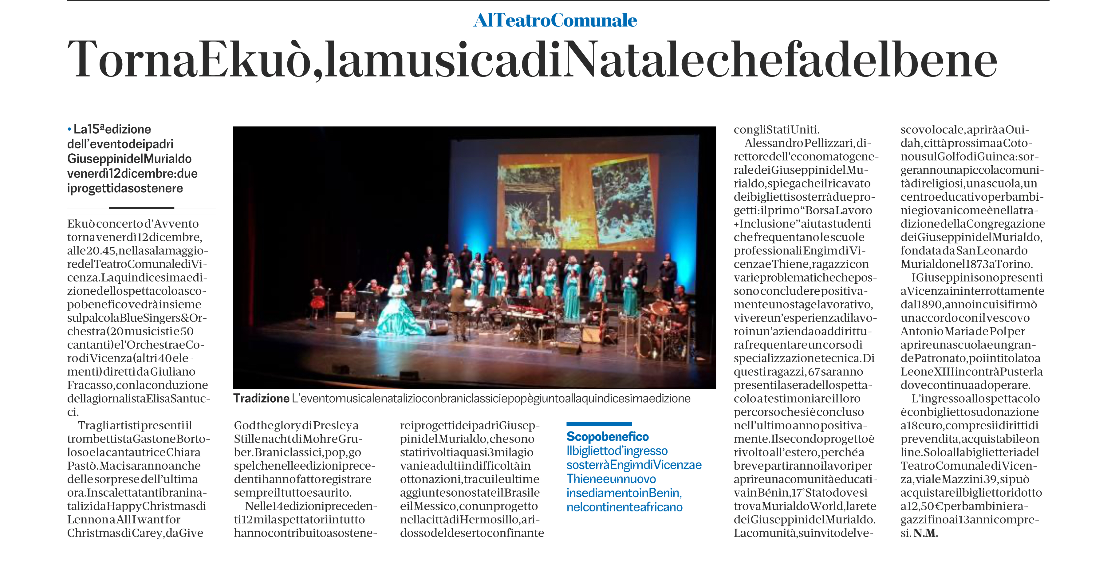 Venerdì 12 Dicembre 2025 alle ore 20.45 torna, nella sua XV edizione, al prestigioso Teatro Comunale di Vicenza, sala maggiore, l’Ekuò Concerto d’Avvento.